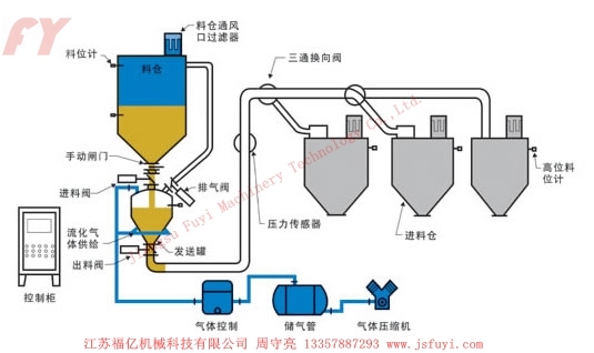 進(jìn)料過(guò)程中,物料通過(guò)鐘罩閥、雙蝶閥或膨脹式蝶閥在重力作用下被加進(jìn)發(fā)送罐中,置換出的空氣通過(guò)排氣閥被釋放出去,使得進(jìn)料更加容易。一旦發(fā)送罐被裝滿(通過(guò)料位計(jì)或稱重顯示物料達(dá)到罐容積的80%),進(jìn)料閥和排氣閥立即自動(dòng)關(guān)閉并密封,而后高壓氣體通過(guò)發(fā)送罐頂部和流化噴嘴被逐漸加入,加入罐中的氣體與物料相混合,當(dāng)罐內(nèi)壓力達(dá)到設(shè)定值后自動(dòng)打開(kāi)出料閥,此時(shí)物料在輸送管線中以流動(dòng)狀態(tài)被加壓,直到發(fā)送罐和輸送管線全部排空。當(dāng)發(fā)送罐內(nèi)的壓力降為零時(shí),氣體供給閥門即被關(guān)閉,同時(shí)剩余氣體也被排出發(fā)送罐和輸送管線。