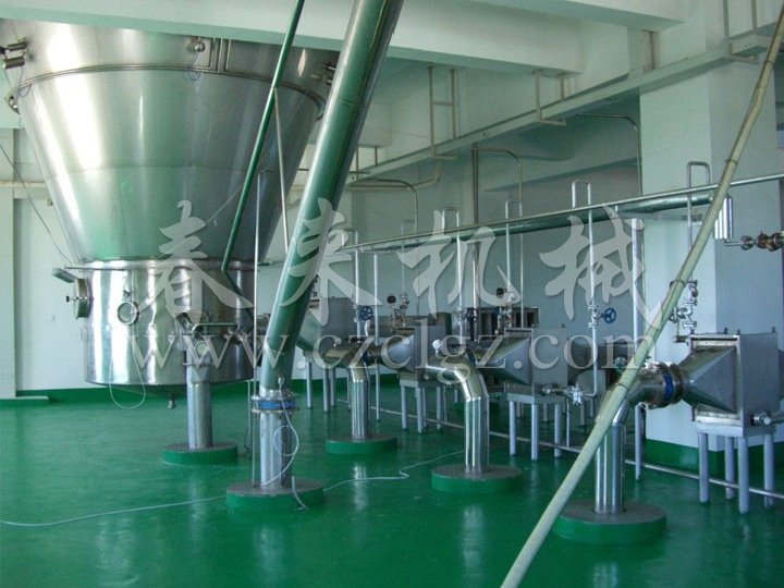 該生產(chǎn)線由供料系統(tǒng)、介質(zhì)循環(huán)系統(tǒng)、空氣加熱凈化系統(tǒng)、干燥塔系統(tǒng)、收料系統(tǒng)、控制系統(tǒng)等多個系統(tǒng)整合而成。主塔系統(tǒng)集中了目前噴霧干燥工程的所有^技術(shù),噴干機組的收料系統(tǒng)由一級旋風(fēng)分離器+布袋除塵器組合形成。一級旋風(fēng)采用高氣量高效率旋風(fēng)進(jìn)行收集,其收粉率能達(dá)到96%左右分,而布袋除塵器是針對蛋白粉類除塵專門設(shè)計的優(yōu)化設(shè)備,能使物料與風(fēng)進(jìn)行完全分離并沉降,布袋為拒水防油防靜電布袋,過濾目數(shù)可達(dá)500目以上。